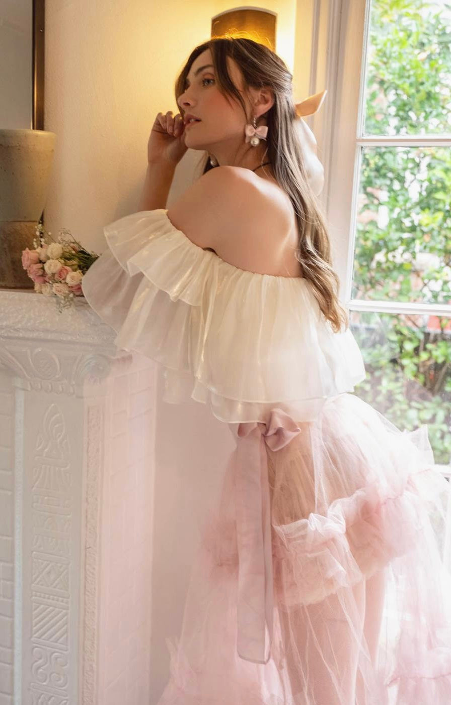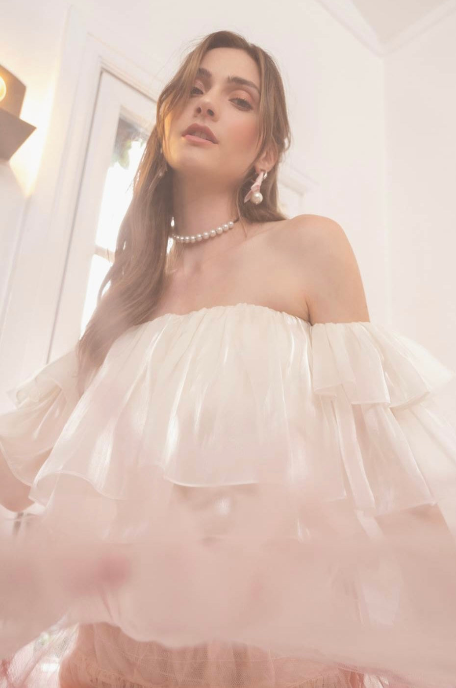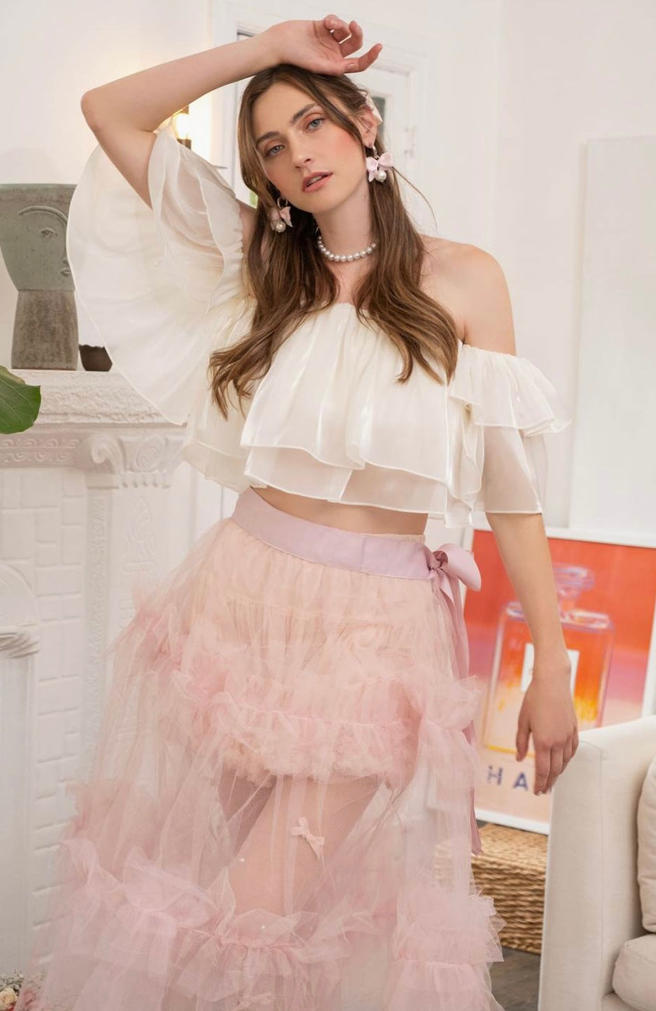 Let your style take flight in the Celestial Flutter crop top—an off-shoulder stunner kissed with metallic shimmer and sheer enchantment. Featuring a straight neckline, airy short ruffle sleeves, and cascading tiered ruffles, this dreamy design floats with every move. The elasticized bust and cuffs offer a soft, secure fit while adding a touch of playful bounce. Whether you’re dancing under stars or dazzling at brunch, this top brings just the right amount of sparkle and magic to your wardrobe.