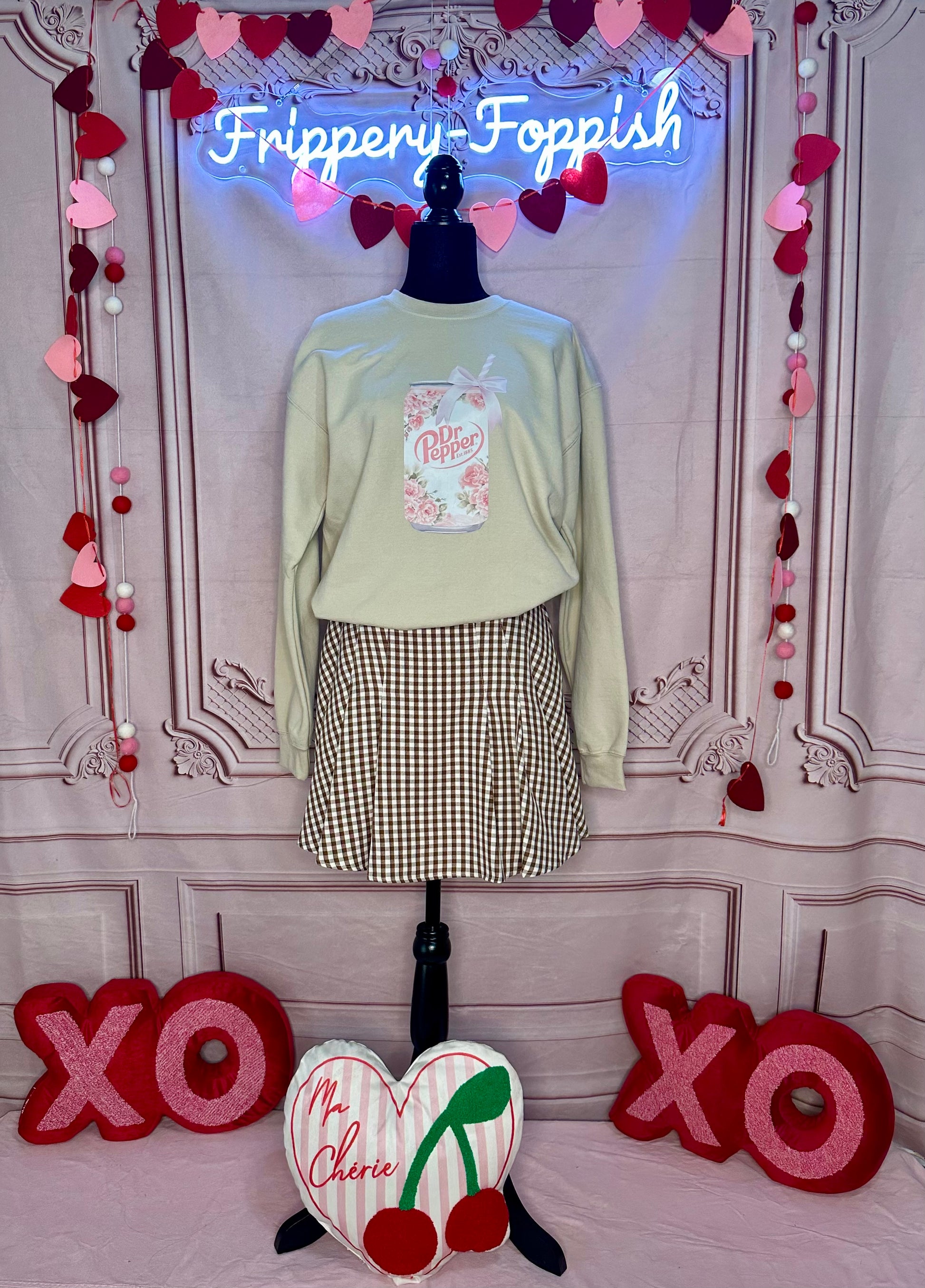 Sweet, fizzy, and oh-so-cute! This vanilla-colored sweatshirt features an irresistibly adorable white Dr. Pepper soda can, dressed to impress with delicate pink flowers, a matching pink straw, and a darling pink bow. It's a bubbly blend of charm and cozy vibes, perfect for soda lovers and style queens alike. Whether you're sipping on something sweet or just keeping it casual, this sweatshirt is a refreshingly fun addition to your wardrobe!