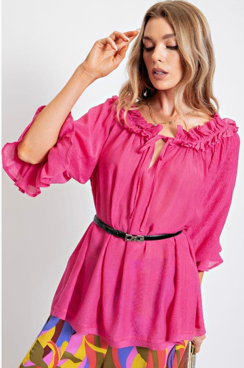 Flowy, flirty, and fabulously fuchsia—The Blushwave Blouse brings romantic ruffles, a keyhole neckline, and dreamy oversized vibes to every outfit.